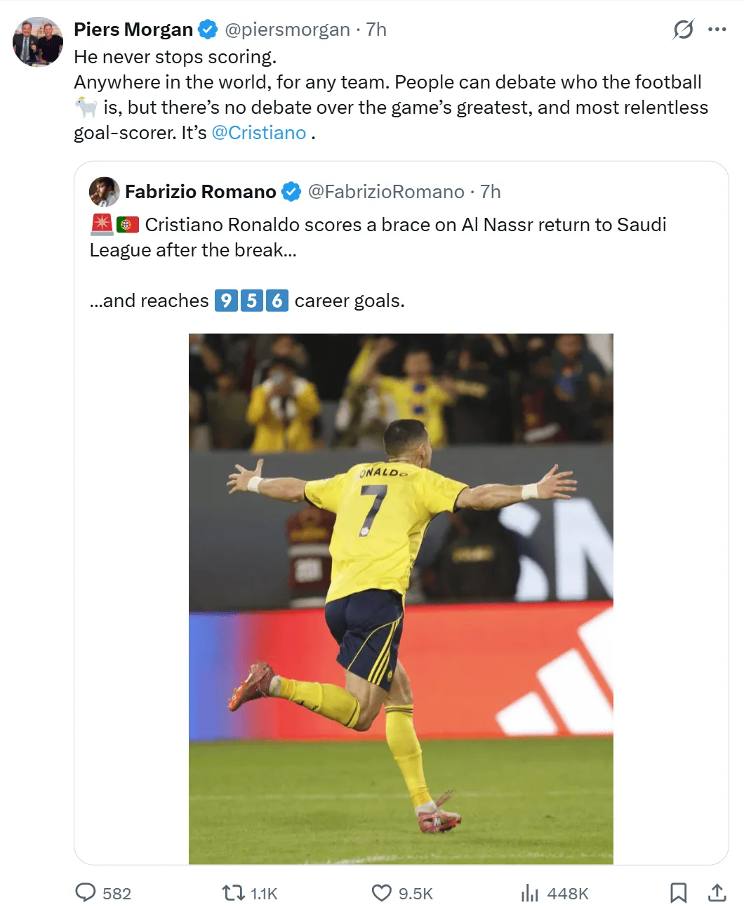 摩根轉發(fā)羅馬諾關(guān)于C羅打進(jìn)第956球的X寫(xiě)道:“他從未停止進(jìn)球。無(wú)論身在何處、無(wú)論為哪支球隊效力,他總能進(jìn)球。人們可以爭論誰(shuí)是足球史上的GOAT,但對于誰(shuí)是這項運動(dòng)歷史上最偉大、最堅持不懈的射手,絕對沒(méi)有任何爭議——那就是C羅?!?/p>