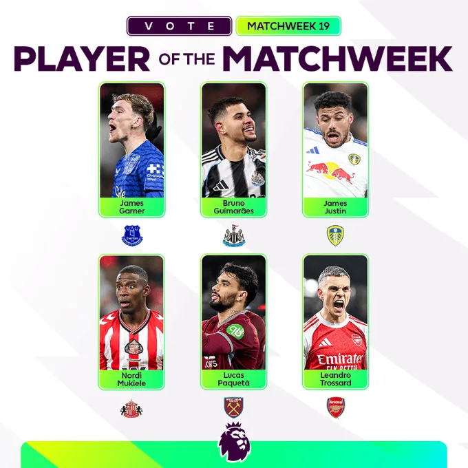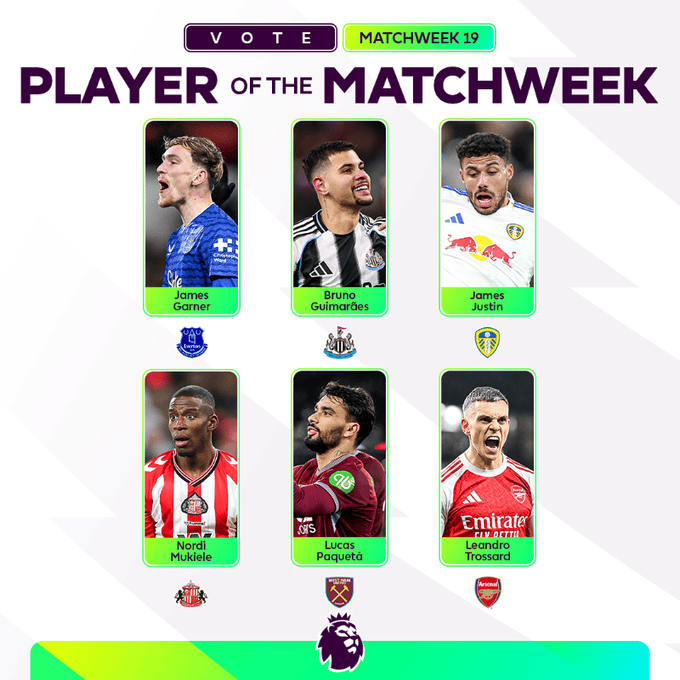虎撲01月03日訊 英超官方公布了第19輪的周最佳候選球員。