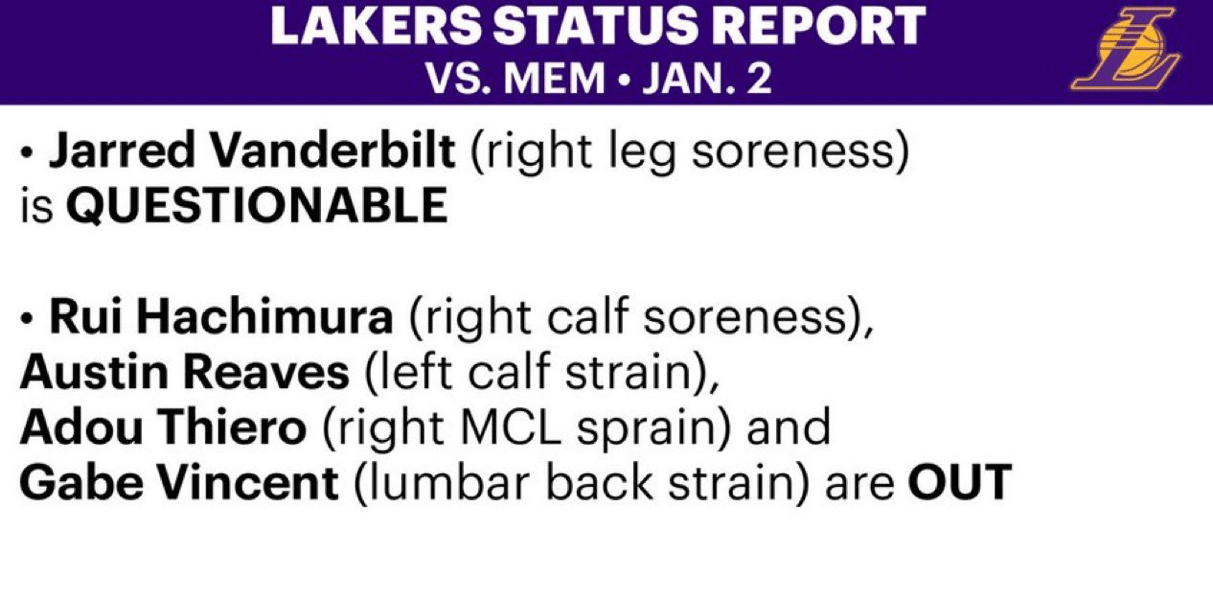 湖人官方更新了傷病報告: