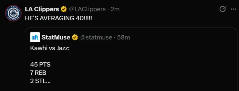 [流言板]官方稱(chēng)贊!快船官方轉發(fā)倫納德過(guò)去5場(chǎng)的數據:他場(chǎng)均40分!