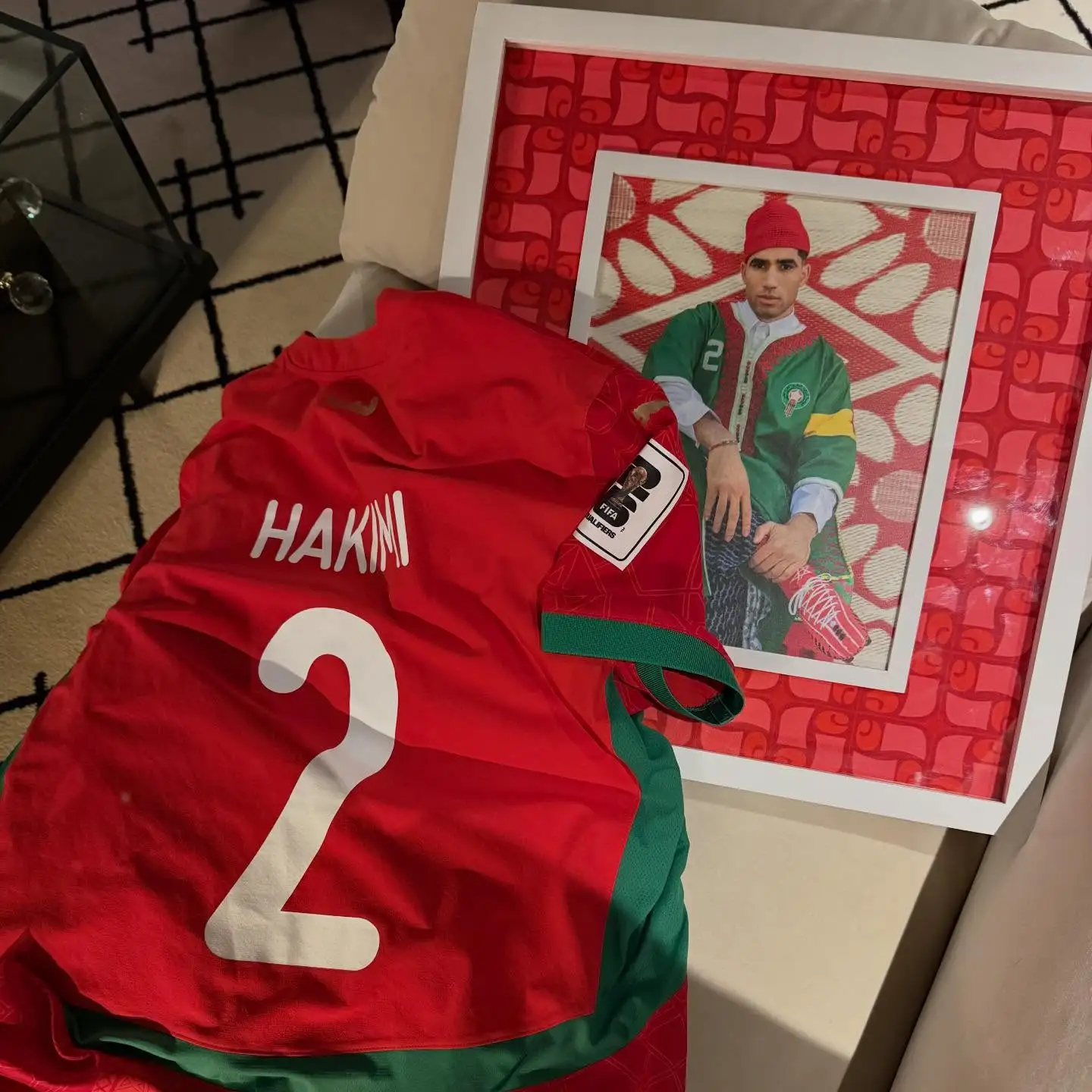 他在今天更新社媒發(fā)布圖集,假期其中有一張他身穿阿什拉夫球衣的圖集照片和一張阿什拉夫球衣+相框的照片。